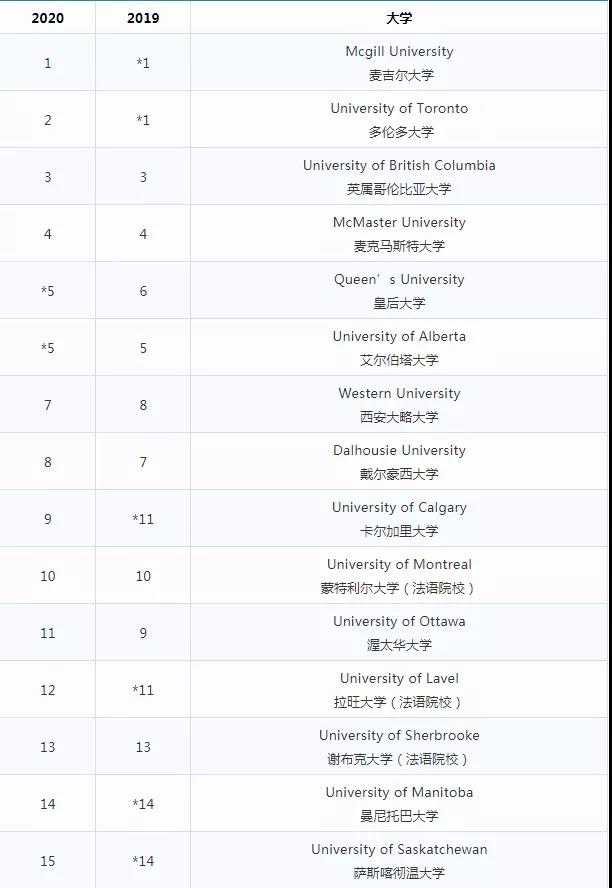 在今年的医博类排名中,麦吉尔大学继续称霸榜单;2018年名列第一的多伦多大学下降了一位,今年排名第2;英属哥伦比亚大学排名第3位;麦克马斯特大学排名第4;皇后大学排名第5;在法语院校中,排名最高的是蒙特利尔大学。